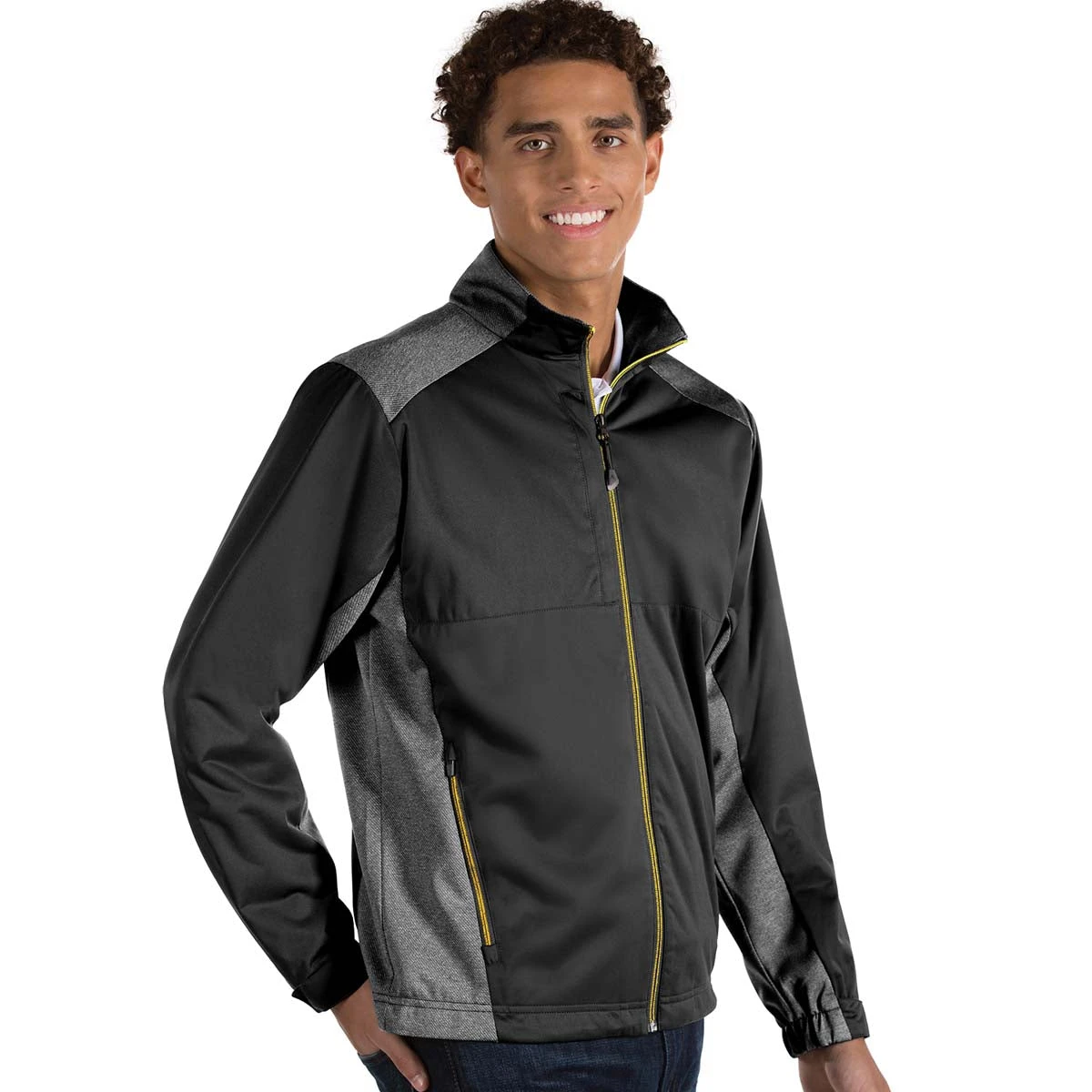 The logoed Antigua Men’s Black/Gold Revolve Full Zip offers classic style and warmth for the wearer to enjoy. With 15 color options available, you are certain to find one which goes great with much of your wardrobe. Some of the features which you’re certain to love with this full zip jacket include the comfortable 100% polyester material, the interlock face which is bonded to the waterproof membrane long-sleeve wind shirt, contrast insets, contrast stitch on the zipper tape, zipper hand pockets, zipper chest pocket, bungee toggle hem, and hook and loop closure. Add your custom embroidery and hand these jackets out to your loyal and hardworking employees as employee apparel.
