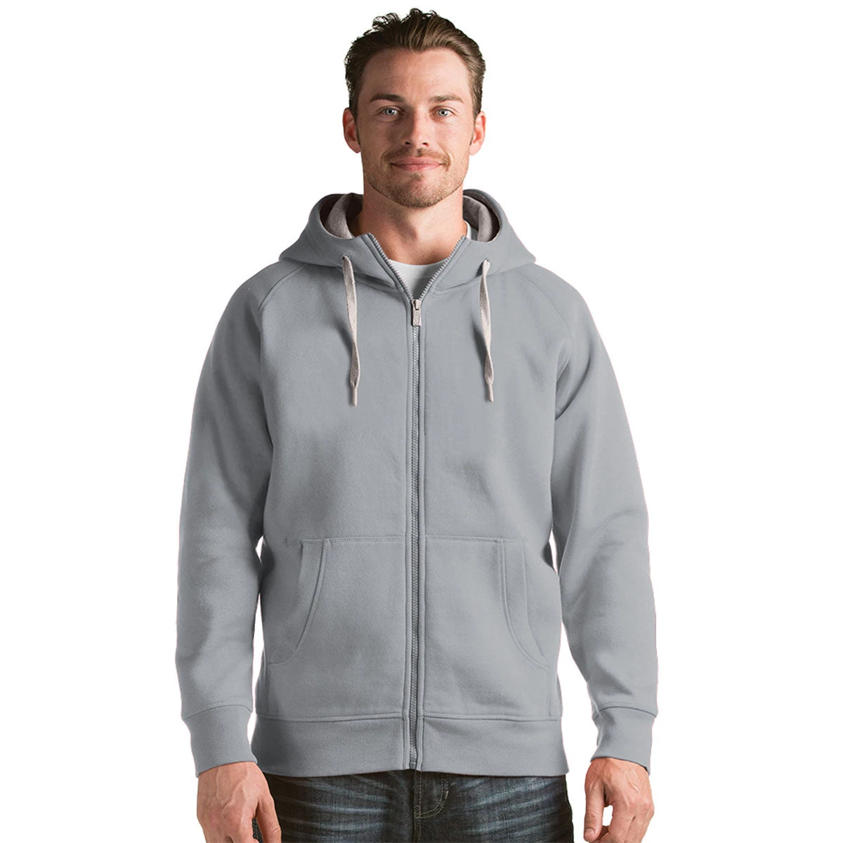 The custom Antigua Men’s Grey Heather Victory Full Zip Hoodie is the perfect companion for your company logo. Super soft cotton blends with highly durable polyester to create the ideal outer layer for both camping trips and golf tournaments. Not to mention a great layering piece for a long day of business travel. Cover stitching at the rib cuff and bottom hem adds a stylish design element to the hoodie. Attach a custom logo on the large imprint area to increase your brand awareness at industry events and recruiting outings. Your team will be more than happy to wear this comfortable full zip during the work week and on the weekends.