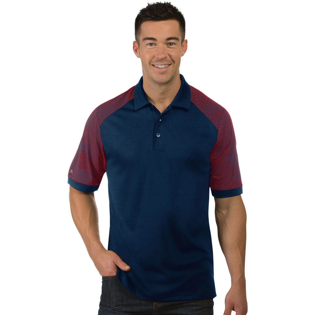 Make a statement with Antigua Men’s Navy/Dark Red Engage two-toned, polyester with Desert Dry moisture wicking jersey. The yarn dye mini-stripe on the sleeves and top shoulder add just a bit of extra to this already impressive look. Add a custom logo to the color(s) of your choice and use these shirts as employee apparel or gifts for the next recruiting event. Stylish and professional enough to wear as corporate apparel, the self-fabric collar, 3 button placket, and Antigua’s triangle patch on the right sleeve will have you looking and feeling your best no matter the environment. Create your custom design and place an order today.