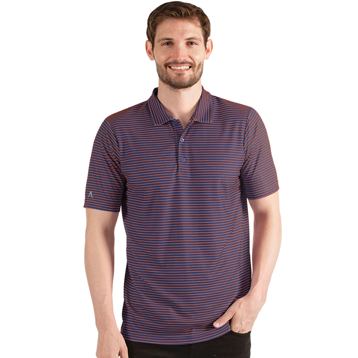 The custom logo Antigua Men’s Navy Heather/Mango Esteem Polo is a must-have item for your promotional product giveaway inventory. Add your embroidery company logo to the polo and hand it out at upcoming golf events and trade shows.