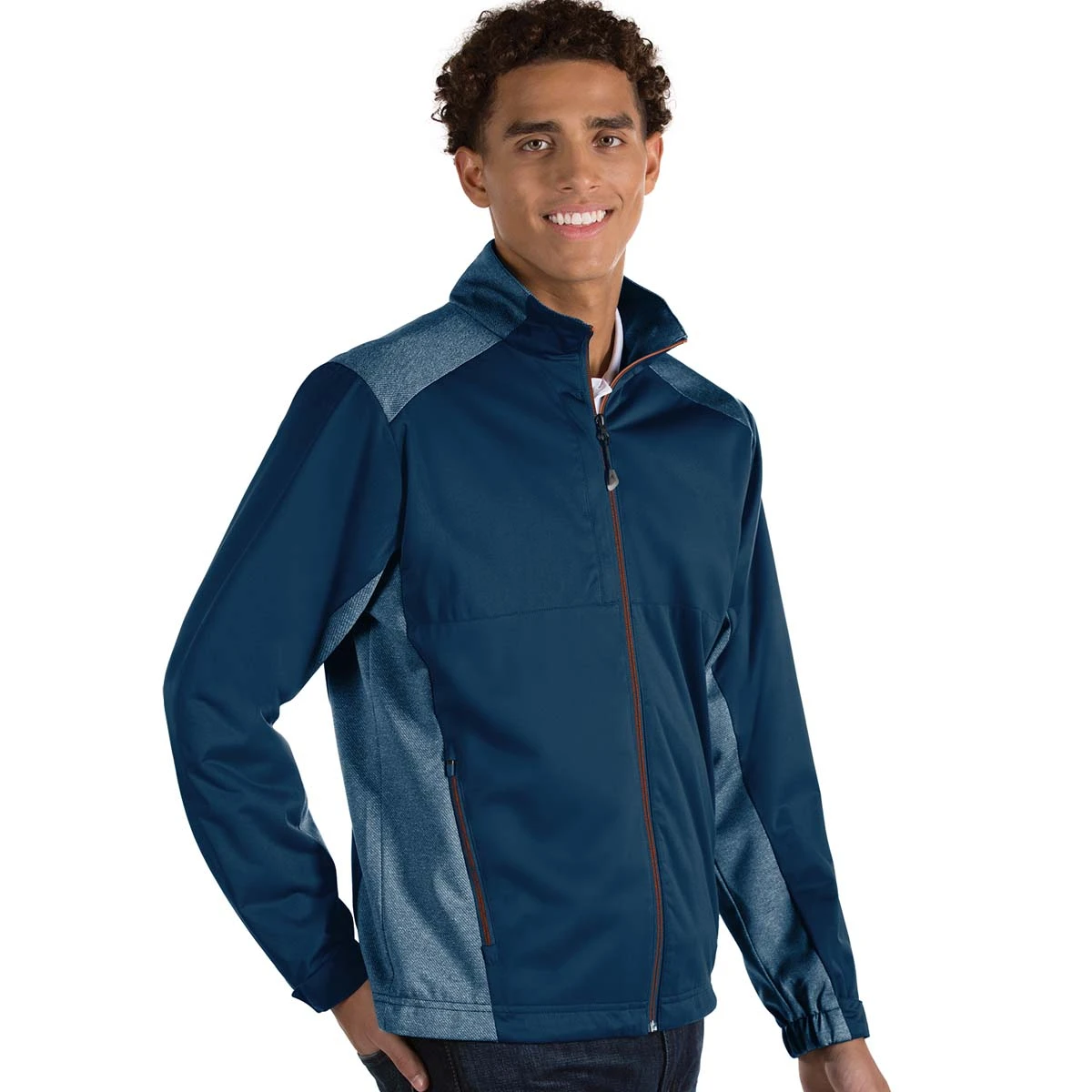 The logoed Antigua Men’s Navy/Mango Revolve Full Zip offers classic style and warmth for the wearer to enjoy. With 15 color options available, you are certain to find one which goes great with much of your wardrobe. Some of the features which you’re certain to love with this full zip jacket include the comfortable 100% polyester material, the interlock face which is bonded to the waterproof membrane long-sleeve wind shirt, contrast insets, contrast stitch on the zipper tape, zipper hand pockets, zipper chest pocket, bungee toggle hem, and hook and loop closure. Add your custom embroidery and hand these jackets out to your loyal and hardworking employees as employee apparel.